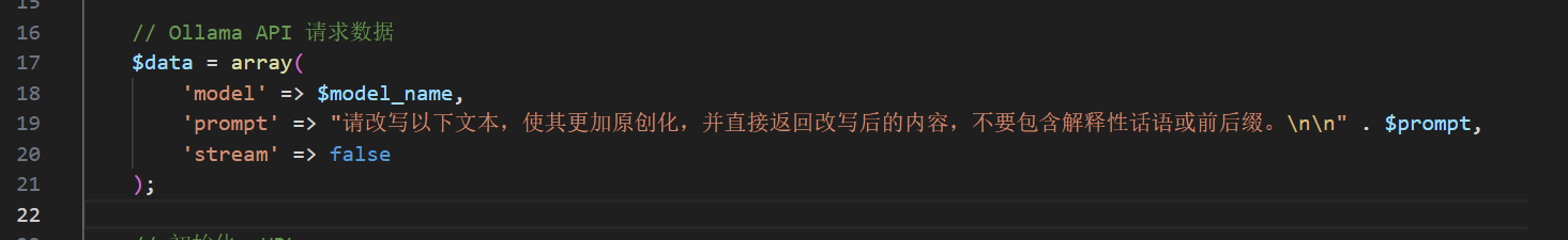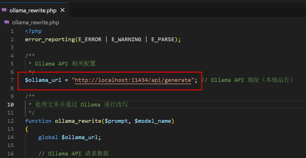 $ollama_url = "http://localhost:11434/api/generate"; // Ollama API 地址(本地运行)
